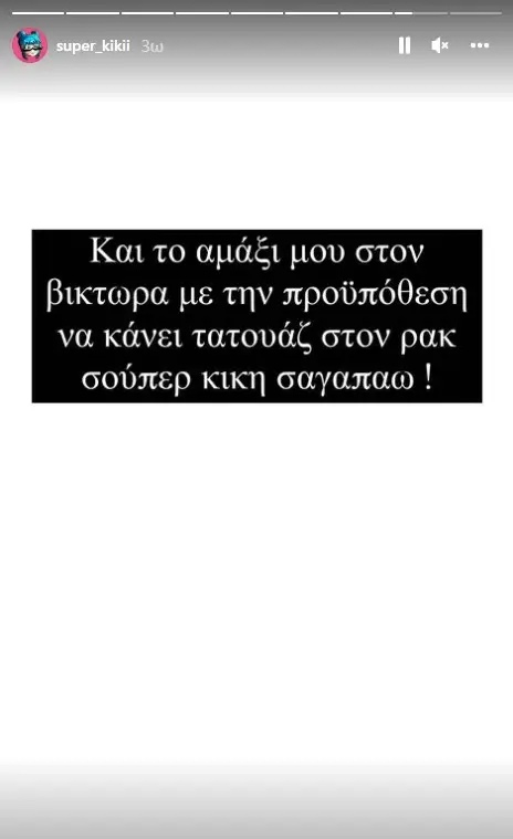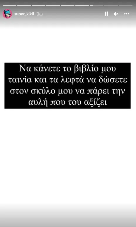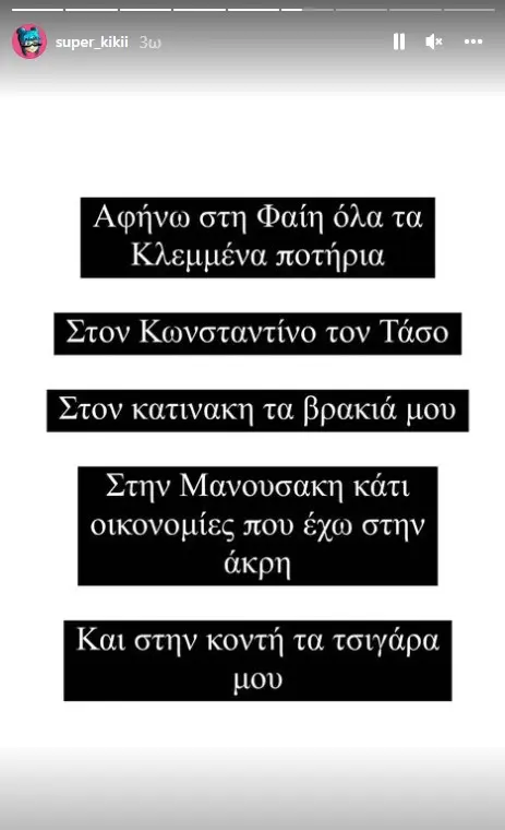Ωστόσο ακόμη και αυτήν την ώρα η Super Κική δεν έχασε το χιούμορ της. Σε άλλα instastories της αναφέρει. «Αφήνω στη Φαίη όλα τα κλεμμένα ποτήρια. Στον Κωνσταντίνο τον Τάσο. Στον Κατινάκη τα βρακιά μου. Στην Μανουσάκη κάτι οικονομίες που έχω στην άκρη. Και στην κοντή τα τσιγάρα μου. Να κάνετε το βιβλίο μου ταινία και τα λεφτά να δώσετε στον σκύλο μου να πάρει την αυλή που του αξίζει. Και το αμάξι μου στον Βίκτωρα με την προϋπόθεση να κάνει τατουάζ στον Ρακ Σούπερ Κική σαγαπάω!».