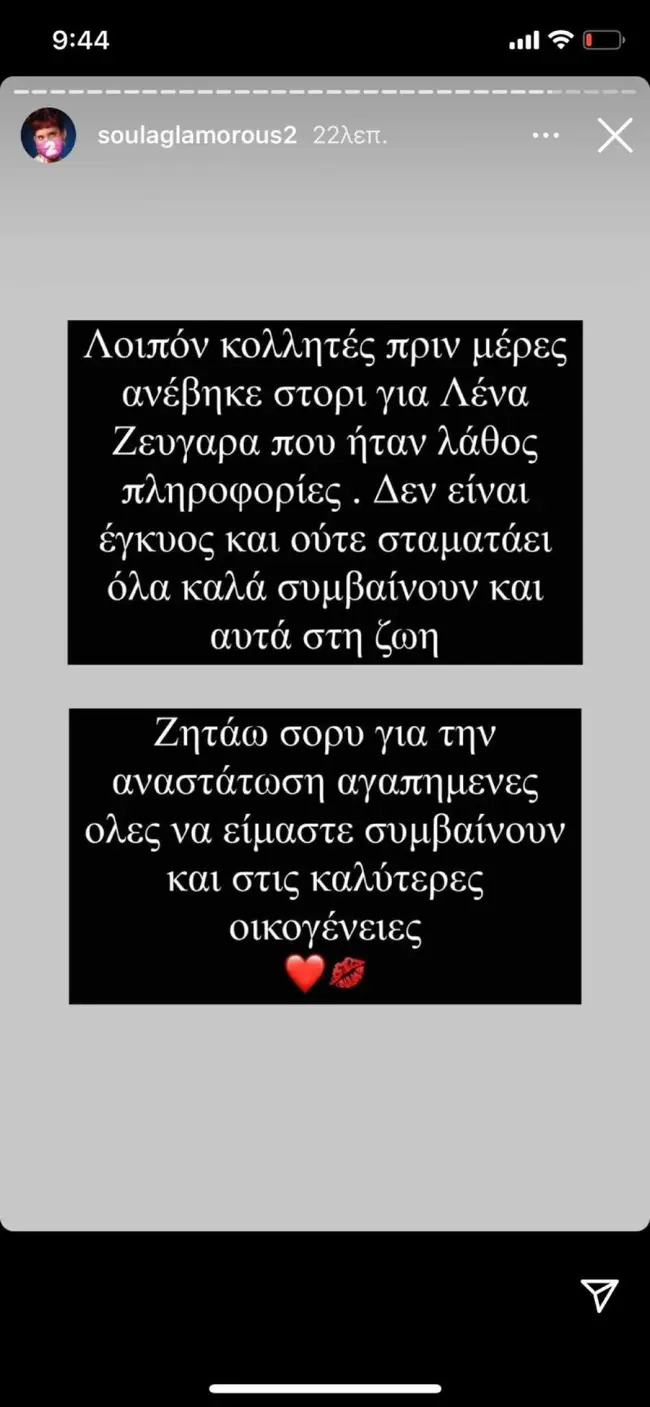 Ωστόσο, η Soula Glamorous και πάλι μέσα από τον λογαριασμό της στο instagram, επανήλθε με update από την υπόθεση που η ίδια ξεκίνησε γράφοντας χαρακτηριστικά: «Λοιπόν κολλητές πριν μέρες ανέβηκε στόρι για την Λένα Ζευγαρά που ήταν λάθος πληροφορίες. Δεν είναι έγκυος, ούτε σταματάει. Όλα καλά, συμβαίνουν και αυτά στη ζωή. Ζητάω συγγνώμη για την αναστάτωση αγαπημένες όλες να είμαστε. Συμβαίνουν και στις καλύτερες οικογένειες».