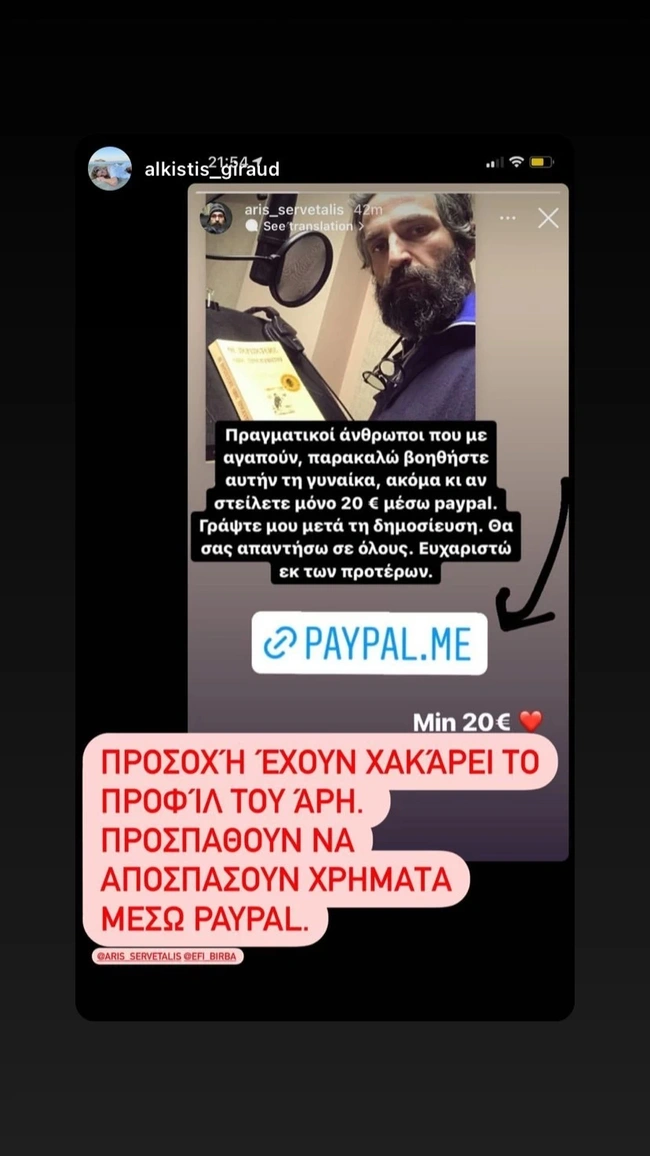 Στον λογαριασμό δημοσιεύτηκε ένα Instagram Story, στο οποίο υποτίθεται ότι ο Αρης Σερβετάλης ζητούσε χρήματα από τον κόσμο. «Πραγματικοί άνθρωποι που με αγαπούν, παρακαλώ βοηθήστε αυτήν την γυναίκα, ακόμα και αν στείλετε μόνο 20 ευρώ μέσω paypal. Γράψτε μου μετά τη δημοσίευση. Θα σας απαντήσω σε όλους. Ευχαριστώ εκ των προτέρων», ανέφερε το story.