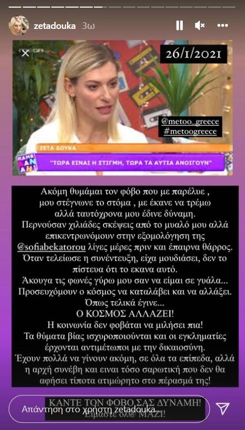 Με αφορμή τη συμπλήρωση ενός χρόνου από εκείνη την ημέρα, το πρωί της Τετάρτης (26/01) η Ζέτα Δούκα ανέβασε ένα στιγμιότυπο από την εκπομπή σε story στο προφίλ της στο Instagram και περιέγραψε τα συναισθήματα που την είχαν κατακλύσει εκείνη τη στιγμή: