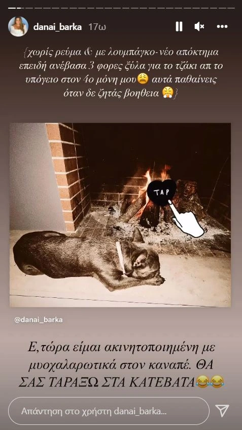 «Χωρίς ρεύμα και με λουμπάγκο, νέο απόκτημα επειδή ανέβασα τρεις φορές ξύλα για το τζάκι από το υπόγειο στον 4ο μόνη μου. Αυτά παθαίνεις όταν δεν ζητάς βοήθεια. Ε, τώρα είμαι ακινητοποιημένη με μυοχαλαρωτικά στον καναπέ», έγραψε η Δανάη Μπαρκα.