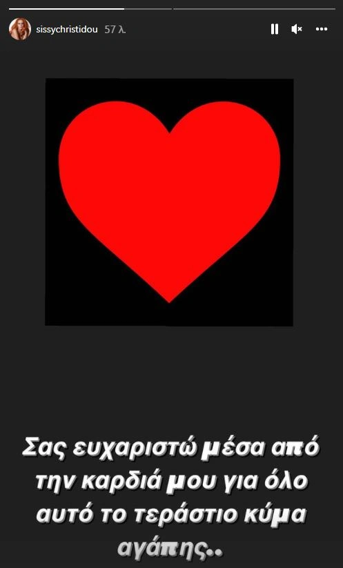«Σας ευχαριστώ μέσα από την καρδιά μου γι’ αυτό το τεράστιο κύμα αγάπης» έγραψε μέσω insta story η Σίσσυ Χρηστίδου.