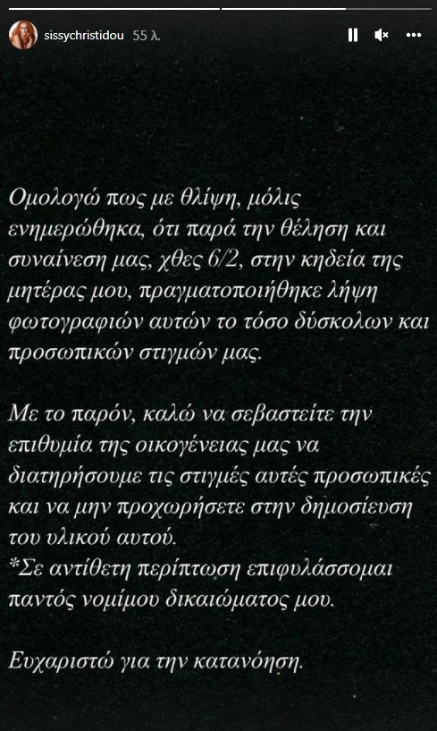 «Ομολογώ πως με θλίψη, μόλις ενημερώθηκα, ότι παρά τη θέληση και συναίνεσή μας, χθες 6/2, στην κηδεία της μητέρας μου πραγματοποιήθηκε λήψη φωτογραφιών αυτών των τόσο δύσκολων και προσωπικών στιγμών μας. Με το παρόν, καλώ να σεβαστείτε την επιθυμία της οικογένειάς μας να διατηρήσουμε τις στιγμές αυτές προσωπικές και να μην προχωρήσετε στη δημοσίευση του υλικού αυτού. Σε αντίθετη περίπτωση επιφυλάσσομαι παντός νομίμου δικαιώματός μου. Ευχαριστώ πολύ για την κατανόηση», επεσήμανε η Σίσσυ Χρηστίδου.