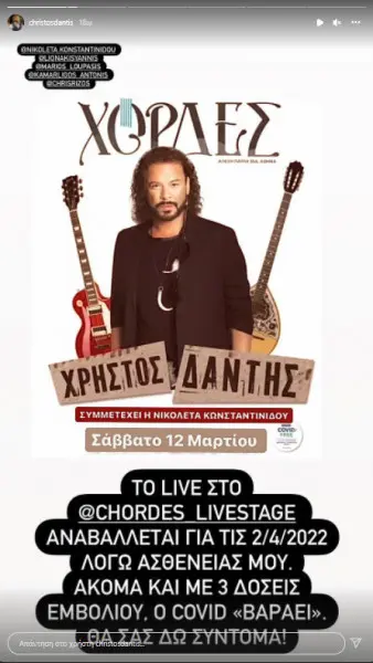 Ο κορονοϊός συνεχίζει να δηλώνει «παρών» και να ταλαιπωρεί τους πολίτες. Μόλις την Παρασκευή εξάλλου ανακοινώθηκαν πάνω από 20.000 κρούσματα στη χώρα και ένα από αυτά ήταν... ο Χρήστος Δάντης. Ο δημοφιλής τραγουδιστής ανακοίνωσε ότι είναι θετικός μέσα από τον προσωπικό του λογαριασμό στο Instagram.