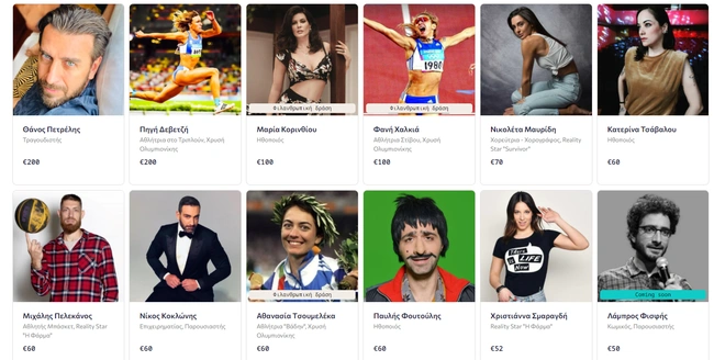 Μετά ακoλουθεί η Μαρία Κορινθίου και η Φανή Χαλκιά, οι οποίες έχουν ορίσει ως τιμή τα 100 ευρώ, τα οποία διαθέτουν όμως για φιλανθρωπικό σκοπό. Πιο κάτω βρίσκουμε την πρώην παίκτρια του Survivor, Νικολέτα Μαυρίδη, με 70 ευρώ, ενώ η ηθοποιός Κατερίνα Τσαβάλου, ο πρώην μπασκετμπολίστας Μιχάλης Πελεκάνος, ο παρουσιαστής Νίκος Κοκλώνης, η χρυσή Ολυμπιονίκης Αθανασία Τσουμελέκα και ο ηθοποιός Παυλής Φουτούλης κοστολογούν την ευχή τους στα 60 ευρώ.