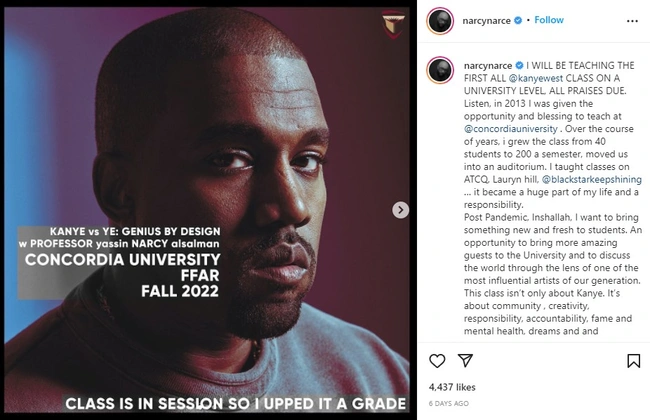 Ο Kanye West φαίνεται ότι αποτελεί εμπνευση για αρκετούς, καθώς θα γίνει μάθημα στο Πανεπιστήμιο Concordia του Μόντρεαλ, όπως ανακοίνωσε ο Γιάσιν «Νάρσι» Αλσαλάμ, ο οποίος θα είναι ο διδάσκων του μαθήματος στη Σχολή Καλών Τεχνών. «Θα διδάξω το πρώτο μάθημα all @kanyewest σε πανεπιστημιακό επίπεδο, αξίζω επαίνους» έγραψε σε ανάρτηση στο Instagram.