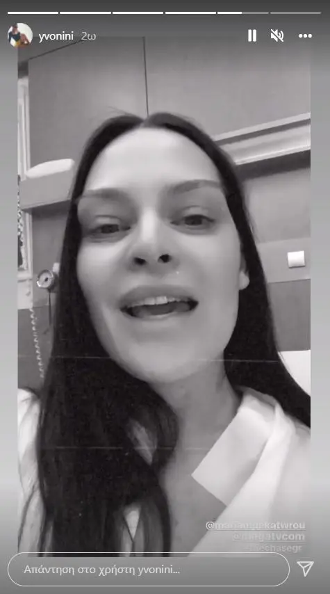 «Γεια σας, όμορφα παιδάκια. Σας ευχαριστώ πάρα πολύ για όλα αυτά τα μηνύματα. Είμαι καλά, έχω κάνει μία μικρή επέμβαση που έπρεπε να γίνει, πιστεύω ότι όλα θα είναι τέλεια έτσι νιώθω. Είμαι εδώ, θα κάνω σήμερα διακοπές στο νοσοκομείο, θα κάνω και τα beaute μου, ευκαιρία είναι και πώς να μην είμαι καλά που βλέπω την κουμπάρα μου, Μαρία Μπεκατώρου. Ευχαριστώ πολύ, πολλά φιλιά», είπε χαρακτηριστικά η Υβόννη Μπόσνιακ.