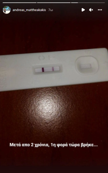 Την είδηση έκανε γνωστή, ο ίδιος μέσα από τον προσωπικό του λογαριασμό στα social media. Ο Ανδρέας Ματθαιακάκης ανέβασε μία φωτογραφία με το θετικό του τεστ και έγραψε: «Μετά από δύο χρόνια, πρώτη φορά τώρα βρήκε»