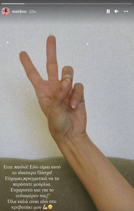 «Ε, παιδιά, εδώ είμαι αυτό το ιδιαίτερο Πάσχα. Εύχομαι πραγματικά να τα περάσατε μούρλια. Ευχαριστώ και για το ενδιαφέρον, όλα καλά εδώ στο κρεβατάκι μου», αρκέστηκε στο να γράψει η Μαίρη Συνατσάκη χωρίς να διευκρινίσει αν υπήρχε κάποιος λόγος για να παραμείνει στο κρεβάτι.