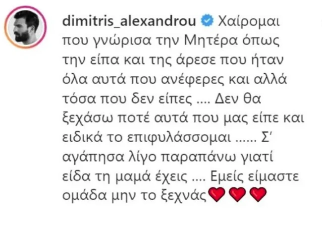 Κάτω από την ανάρτησή της ο σύντροφός της Δημήτρης Αλεξάνδρου έκανε ένα συγκινητικό σχόλιο. «Χαίρομαι που γνώρισα την Μητέρα όπως την είπα και της άρεσε που ήταν όλα αυτά που ανέφερες αλλά και τόσα που δεν είπες. Δε θα ξεχάσω ποτέ αυτά που μας είπε και ειδικά το επιφυλάσσομαι… Σ’ αγάπησα λίγο παραπάνω γιατί είδα τι μαμά έχεις. Εμείς είμαστε ομάδα μην το ξεχνάς».