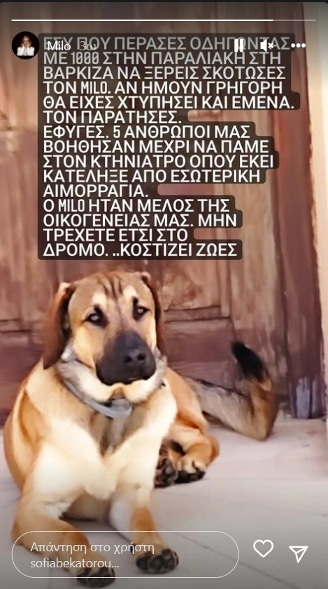 «Εσύ που πέρασες οδηγώντας με 1000 στην παραλιακή στη Βάρκιζα, να ξέρεις σκότωσες τον Milo. Αν ήμουν γρήγορη θα είχες χτυπήσει κι εμένα. Τον παράτησες. Έφυγες. Πέντε άνθρωποι μας βοήθησαν μέχρι να πάμε στον κτηνίατρο, όπου εκεί κατέληξε από εσωτερική αιμορραγία. Ο Milo ήταν μέλος της οικογένειάς μας. Μη τρέχετε έτσι στον δρόμο… κοστίζει ζωές», ανέφερε χαρακτηριστικά η Σοφία Μπεκατώρου.