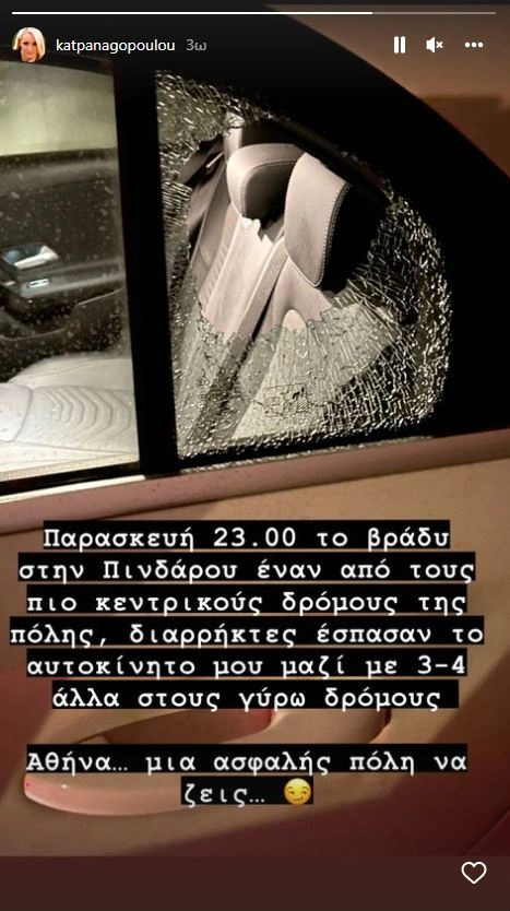 «Παρασκευή 23:00 το βράδυ στην Πινδάρου, έναν από τους πιο κεντρικούς δρόμους της πόλης, διαρρήκτες έσπασαν το αυτοκίνητό μου μαζί με 3 - 4 άλλα στους γύρω δρόμους… Αθήνα, μια ασφαλής πόλη να ζεις», έγραψε η Κατερίνα Παναγοπούλου, ανεβάζοντας μια σχετική φωτογραφία σε στόρι στο προφίλ της στο Instagram.