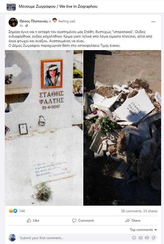 Τα παραπάνω είχαν σαν αποτέλεσμα να ξεσπάσει η Μαίρη Μπάρκουλη, η οποία αναδημοσίευσε την ανάρτηση και έγραψε: «Ντροπή… Είχα ενημερώσει να πληρώσω εγώ την εκταφή και να αναλάβω τα οστά. Και ο δήμαρχος μου υποσχέθηκε ότι δεν πρόκειται να τον βγάλει κανείς. Ντροπή και αίσχος».