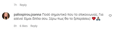 Η Ολυμπία Κρασαγάκη, η φωτογράφος που μάς χάρισε πριν από λίγο καιρό το πρώτο πορτρέτο της Ιωάννας Παλιοσπύρου χωρίς μάσκα, δέχθηκε ένα μήνυμα στήριξης από την Ιωάννα. «Ποσό σημαντικό που το επικοινωνείς. Για εσένα! Είμαι δίπλα σου. Ξέρω πως θα το ξεπεράσεις», έγραψε η Ιωάννα.
