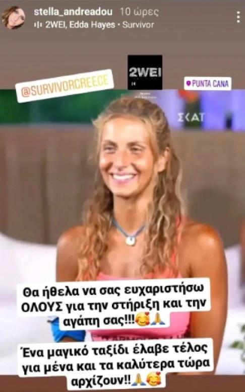 Η Στέλλα Ανδρέαδου επέστρεψε στην Ελλάδα και έκανε την πρώτη της ανάρτηση στα social media μετά την αποχώρησή της από το Survivor. Η πρώην παίκτρια του ριάλιτι επιβίωσης θέλησε μέσω ανάρτησης στο Instagram, να ευχαριστήσει τον κόσμο που την στήριξε. «Είναι μέχρι να το συνειδητοποιήσω, έχω σοκαριστεί. Είμαι ευγνώμων που το έζησα, πήρα φοβερά μαθήματα ζωής και θέλω να κρατήσω μόνο τα καλά. Θα βγω έξω καλύτερος άνθρωπος», είχε πει σε δήλωσή της.