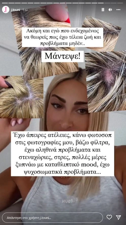 «Αυτά εδώ είναι στο δικό μου κεφάλι και σε κανενός άλλου κεφάλι. Θέλω να ξέρετε ότι τίποτα δεν είναι τόσο τέλειο, όπως το φαντάζεστε και για να φτιάχνετε τέλεια την κάθε ημέρα σας, πρέπει να δουλεύετε για αυτό. Να μην τα παρατάτε και να μην συγκρίνετε τον εαυτό σας με άλλους. Ο καθένας τραβάει τα δικά του προβλήματα. Εστιάστε και δουλέψτε στον εαυτό σας, να σκέφτεστε θετικά και όλα θα πάνε καλά», συμβούλεψε τους followers της η Ιωάννα Τούνη.