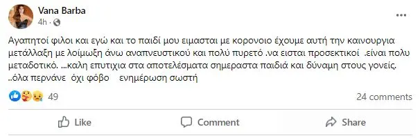 «Αγαπητοί φίλοι και εγώ και το παιδί μου είμαστε με κορονοϊό έχουμε αυτή την καινούργια μετάλλαξη, με λοίμωξη άνω αναπνευστικού και πολύ πυρετό. Να είστε προσεκτικοί, είναι πολύ μεταδοτικό… καλή επιτυχία στα αποτελέσματα σήμερα στα παιδιά και δύναμη στους γονείς… όλα περνάνε, όχι φόβο, ενημέρωση σωστή», ανέφερε στην ανάρτησή της η Βάνα Μπάρμπα με τους διαδικτυακούς της φιλους να σπεύδουν να ευχηθούν περαστικά.