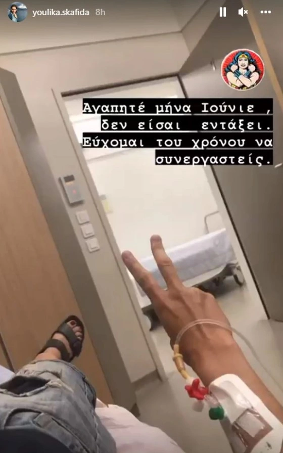 Η ηθοποιός ανάρτησε μια φωτογραφία όπου απεικονίζεται το χέρι της, με ορούς χωρίς ωστόσο να κάνει γνωστή την αιτία για την οποία βρέθηκε στο νοσοκομείο. «Αγαπητέ μήνα Ιούνιε δεν είσαι εντάξει. Εύχομαι του χρόνου να συνεργαστείς», έγραψε η Γιούλικα Σκαφιδά χωρίς να δώσει περισσότερα στοιχεία για την κατάσταση της υγείας της.