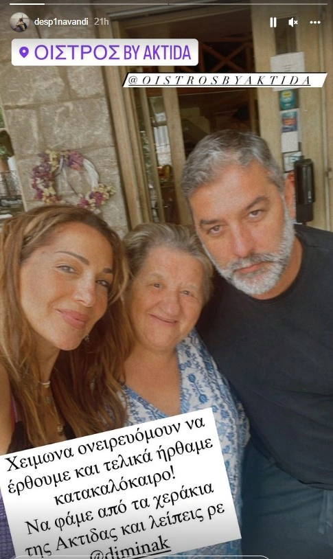 Η Δέσποινα Βανδή και ο Βασίλης Μπισμπίκης είναι ένα από τα πιο ερωτευμένα ζευγάρια της ελληνικής showbiz και από την ημέρα που έγινε γνωστή η σχέση τους, δεν κρύβουν τον έρωτά τους. Το ζευγάρι βρέθηκε για ολιγοήμερες διακοπές στην Αράχωβα και η Δέσποινα Βανδή μοιράστηκε με τους διαδικτυακούς της φίλους στο Instagram, μία νέα φωτογραφία της με τον Βασίλη Μπισμπίκη.
