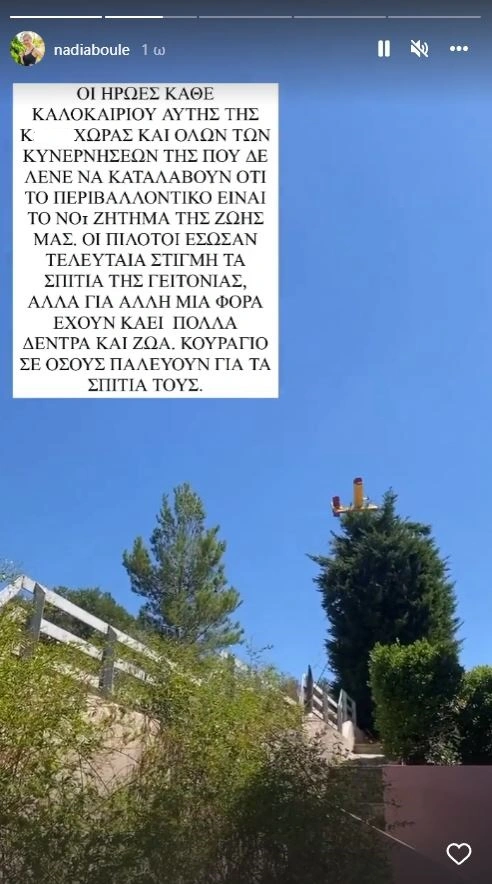 «Οι ήρωες κάθε καλοκαιριού αυτής της κ***χωρας και όλων των κυβερνήσεών της που δε λένε να καταλάβουν ότι το περιβαλλοντικό είναι το Nο 1 ζήτημα της ζωής μας. Οι πιλότοι έσωσαν την τελευταία στιγμή τα σπίτια της γειτονιάς, αλλά για άλλη μια φορά έχουν καεί πολλά δέντρα και ζώα. Κουράγιο σε όσους παλεύουν για τα σπίτια τους», έγραψε η Νάντια Μπουλέ.