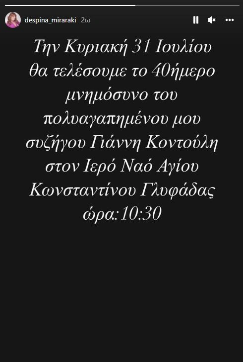 «Την Κυριακή 31 Ιουλίου θα τελέσουμε το 40ήμερο μνημόσυνο του πολυαγαπημένου μου συζύγου Γιάννη Κοντούλη στον Ιερό Ναό Αγίου Κωνσταντίνου Γλυφάδας, ώρα 10:30», έγραψε η Δέσποινα Μοιραράκη, η οποία λίγες ημέρες νωρίτερα σε ανάρτησή της είχε συγκινήσει με όλα όσα είχε γράψει για τον Γιάννη Κοντούλη.