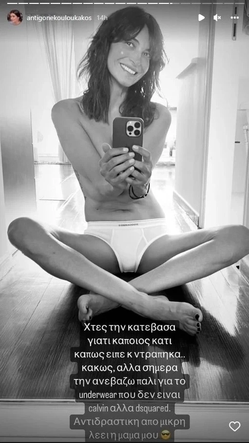 Μία ημέρα μετά, όμως, η Αντιγόνη Κουλουκάκου ανέβασε και πάλι το στιγμιότυπο, εξηγώντας στους διαδικτυακούς της φίλους: «Χθες την κατέβασα γιατί κάποιος, κάτι, κάπως είπε και ντράπηκα… Κακώς… Αλλά σήμερα την ανεβάζω πάλι για το underwear! Αντιδραστική από μικρή λέει η μαμά μου» σημειώνει χαρακτηριστικά η Αντιγόνη Κουλουκάκου στην ιστορία που μοιράστηκε μέσα από τον προσωπικό της λογαριασμό στο Instagram.
