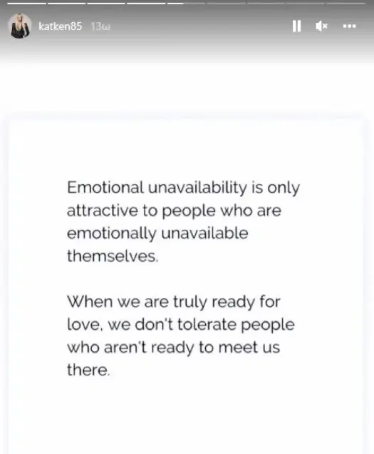 «Το να είσαι συναισθηματικά μη διαθέσιμος είναι ελκυστικό μόνο σε ανθρώπους που είναι οι ίδιοι συναισθηματικά μη διαθέσιμοι. Όταν είμαστε πραγματικά έτοιμοι να αγαπήσουμε, δεν ανεχόμαστε ανθρώπους που δεν είναι έτοιμοι να μας συναντήσουν εκεί», λέει στο story της.