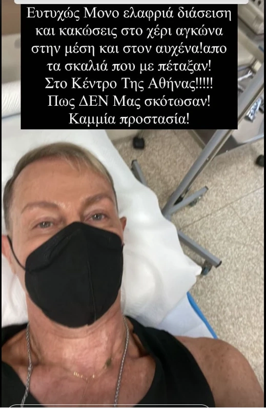 «Στην καρδιά της Αθήνας!! Πριν λίγο στα σκαλιά της πλατείας Συντάγματος όπως κατεβαίνουμε να πάμε προς Ερμού, έπεσε ένα μπουλούκι από αλλοδαπούς Αλγερινοί η Πακιστανοί με σκοπό να μας κλέψουν κλείνοντας μας τον δρόμο! Το αντιληφθήκαμε αμέσως της πρόθεση τους για κλοπή και ώσπου να αντιδράσουμε πετάγοντας μας μπουκάλια, χτύπησαν τον φίλο μου με στιλέτο στο πρόσωπο τραυματίζοντας τον, εμένα με πέταξαν με την μούρη από τα σκαλιά και αστυνομία πουθενά!!!! Ύστερα θέλουμε και τουρισμό! Καμία προστασία, Αίσχος» έγραψε ο σχεδιαστής.