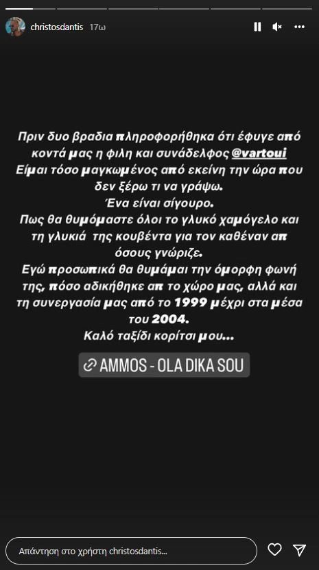 «Πριν δύο βράδια πληροφορήθηκα ότι έφυγε από κοντά μας η φίλη μου και συνάδελφος @varoui. Είμαι τόσο μαγκωμένος από εκείνη την ώρα που δεν ξέρω τι να γράψω. Ένα είναι σίγουρο. Πως θα θυμόμαστε όλοι το γλυκό χαμόγελο και τη γλυκιά της κουβέντα για τον καθένα απ’ όσους γνώριζε. Εγώ προσωπικά θα θυμάμαι την όμορφη φωνή της, πόσο αδικήθηκε απ’ το χώρο μας, αλλά και τη συνεργασία μας από το 1999 μέχρι στα μέσα του 2004. Καλό ταξίδι, κορίτσι μου», έγραψε ο Χρήστος Δάντης για την αγαπημένη του φίλη και συνάδελφο .