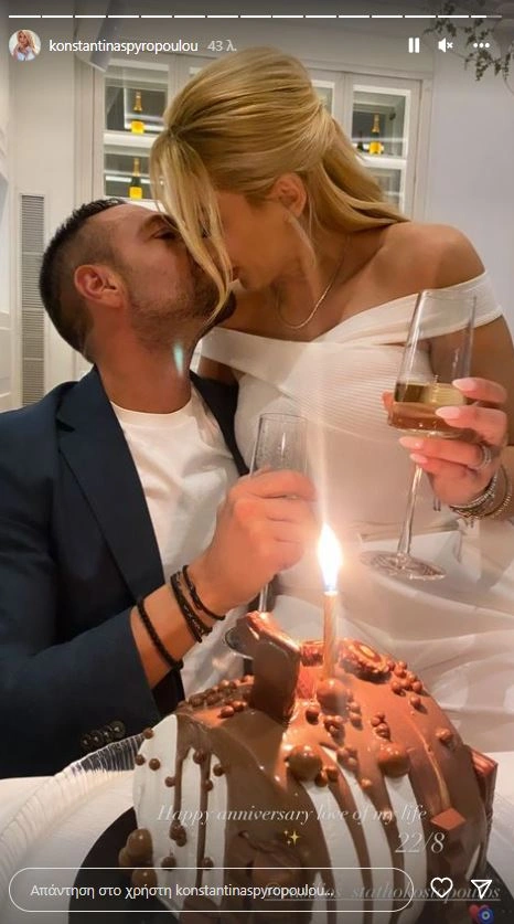 «Ευτυχισμένη επέτειο, έρωτα της ζωής μου - 22/8», έγραψε η Κωνσταντίνα Σπυροπούλου, η οποία, σύμφωνα με τα δημοσιεύματα, διανύει τους πρώτους μήνες της εγκυμοσύνης της αν και η ίδια μέχρι στιγμής δεν έχει κάνει κάποιο σχετικό σχόλιο.