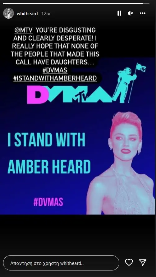 «MTV, είσαι αηδιαστικό και ξεκάθαρα απελπισμένο! Ελπίζω πραγματικά ότι κανένας από τους ανθρώπους που έκαναν αυτό το κάλεσμα δεν έχει κόρες», έγραψε στο story της η Γουίτνεϊ Χερντ, προσθέτοντας το hashtag: «Στέκομαι δίπλα στην Άμπερ Χερντ».