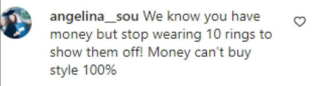 «Οκ. Το καταλάβαμε. Έχεις κοσμήματα και διαμάντια», της έγραψε ένας χρήστης στα σχόλια, με κάποιον άλλο να συμπληρώνει: «Είσαι η πιο αυτάρεσκη διασημότητα στον κόσμο».