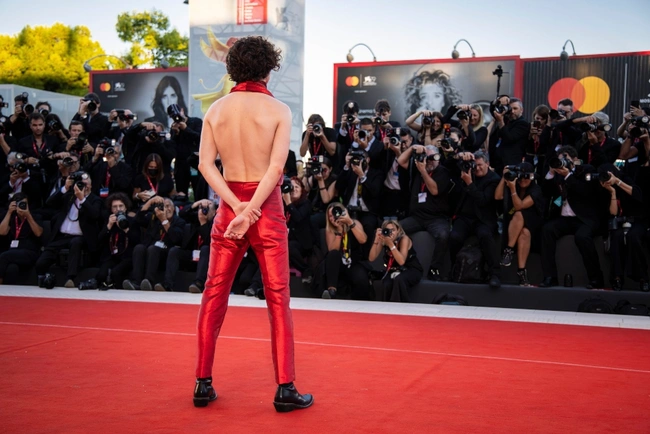 Στο κόκκινο χαλί του Φεστιβάλ Κινηματογράφου της Βενετίας, την Παρασκευή (2/9) στην πρεμιέρα της επερχόμενης ταινίας του «Bones and All» ο 26χρονος Τιμοτέ Σαλαμέ έκανε ίσως την πιο τολμηρή του επιλογή μέχρι σήμερα, φορώντας ένα κόκκινο ολόσωμο σύνολο, δημιουργία του σχεδιαστή Χάιντερ Άκερμαν, η οποία άφηνε ακάλυπτη την πλάτη του. Ο νεαρός ηθοποιός, ο οποίος μας έχει συνηθίσει σε εκκεντρικές εμφανίσεις, φορούσε μαύρες μπότες, μαύρα γυαλιά ηλίου, γύρω από το λαιμό του είχε τυλιγμένο ένα φουλάρι ίδιου χρώματος, ενώ βραχιόλι και ασημένια δαχτυλίδια ολοκλήρωναν την ενδυματολογική του επιλογή.