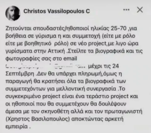 Η αρχική αγγελία του Χρήστου Βασιλόπουλου που μπήκε στο προφίλ του στο Facebook και άνοιξε τους ασκούς του Αιόλου ήταν η ακόλουθη: «Ζητούνται σπουδαστές/ ηθοποιοί ηλικίας 25-70, για βοήθεια σε γύρισμα ή και συμμετοχή (είτε με ρόλο είτε με βοηθητικό ρόλο) σε νέο project με γυρίσματα στην Αττική. Στείλτε τα βιογραφικά και τις φωτογραφίες σας στο email:… μέχρι τις 24 Σεπτέμβρη. Δεν θα υπάρχει πληρωμή, όμως, η παραγωγή θα κρατήσει όλα τα βιογραφικά των συμμετεχόντων για μελλοντική συνεργασία. Το συγκεκριμένο project είναι ένα τεράστιο project και οι ηθοποιοί που θα συμμετέχουν, θα δουλέψουν άμεσα με τον σκηνοθέτη, αλλά και τον πρωταγωνιστή (Χρήστος Βασιλόπουλος) αποκτώντας αρκετή εμπειρία», έγραψε στην αγγελία ο ηθοποιός.