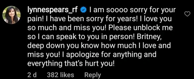 Η Λιν Σπίαρς ζήτησε δημόσια συγγνώμη στην κόρη της, Μπρίτνεϊ Σπίαρς, για τον «πόνο» που υπέστη η ποπ σταρ κατά τη διάρκεια της 13χρονης υποχρεωτικής κηδεμονίας, στην οποία την είχε επιβάλει ο πατέρας της. Η Λιν Σπίαρς ζήτησε από τη Μπρίτνεϊ να τη συγχωρήσει, με ένα σχόλιο στο Instagram κάτω από μια μακροσκελή ανάρτηση της ποπ σταρ που έγραφε ότι «μια γνήσια συγγνώμη θα βοηθούσε να κλείσει η οικογενειακή τους διαμάχη». «Λυπάμαι πολύ για τον πόνο σου. Λυπάμαι εδώ και χρόνια. Σε αγαπώ πολύ και μου λείπεις. Μπρίτνεϊ, βαθιά μέσα σου ξέρεις πόσο πολύ σε αγαπώ και μου λείπεις. Ζητώ συγγνώμη για οτιδήποτε σε πλήγωσε», της έγραψε η Λιν Σπίαρς.