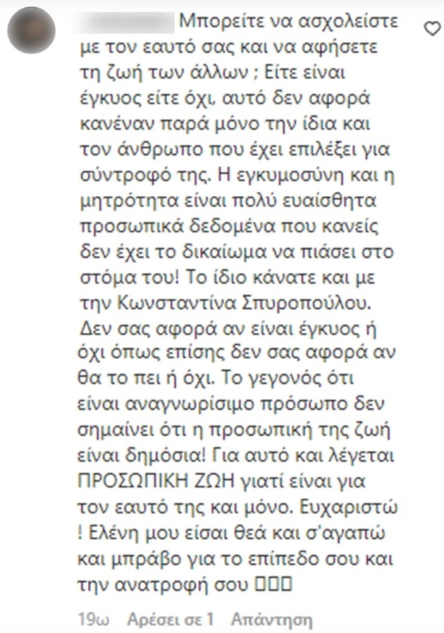 Κάποιοι έσπευσαν να της ευχηθούν, ενώ υπήρχαν και κάποιοι που σχολίασαν ότι το πότε και αν θα αποκαλύψει κάτι τόσο προσωπικό και ευαίσθητο, αφορά την ίδια.