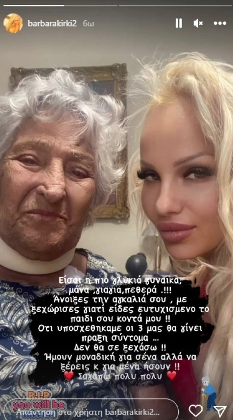 Στο Instagram story που ανάρτησε μέσα από τον προσωπικό της λογαριασμό, η Βαρβάρα Κίρκη ανέβασε μία κοινή τους φωτογραφία και έγραψε: «Είσαι η πιο γλυκιά γυναίκα, μάνα, γιαγιά, πεθερά!!! Άνοιξες την αγκαλιά σου, με ξεχώρισες γιατί είδες ευτυχισμένο το παιδί σου κοντά μου!! Ότι υποσχεθήκαμε οι 3 μας θα γίνει πράξη σύντομα... Δεν θα σε ξεχάσω!! Ήμουν μοναδική για σένα αλλά να ξέρεις και για μένα ήσουν!! Σε αγαπώ πολύ πολύ!!».