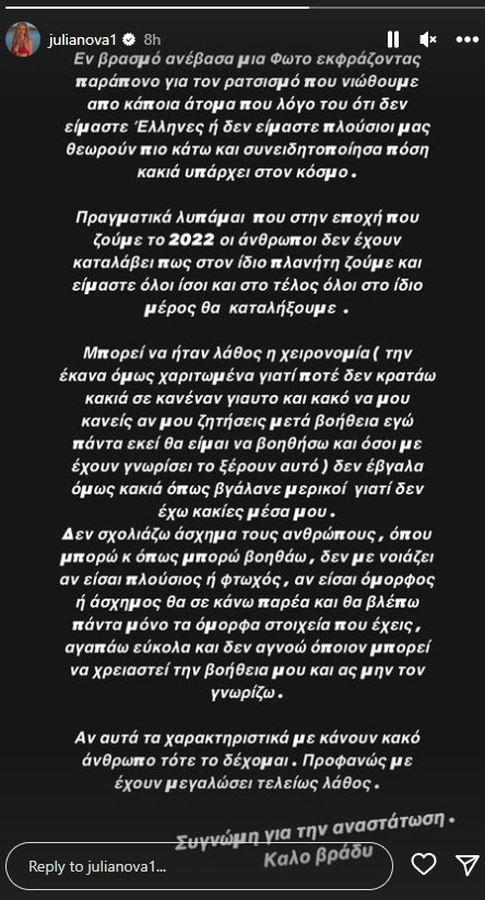 Δε σχολιάζω άσχημα τους ανθρώπους, όπου μπορώ και όπως μπορώ βοηθάω, δε με νοιάζει αν είσαι πλούσιος ή φτωχός, αν είσαι όμορφος ή άσχημος, θα σε κάνω παρέα και θα βλέπω πάντα μόνο τα όμορφα στοιχεία που έχεις, αγαπώ εύκολα και δεν αγνοώ όποιον μπορεί να χρειαστεί τη βοήθειά μου και ας μην τον γνωρίζω. Αν αυτά τα χαρακτηριστικά με κάνουν κακό άνθρωπο, τότε το δέχομαι. Προφανώς με έχουν μεγαλώσει τελείως λάθος. Συγγνώμη για την αναστάτωση» έγραψε η Τζούλια Νόβα στο Instagram.
