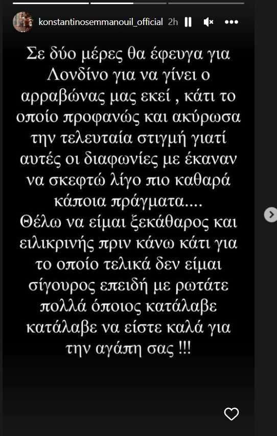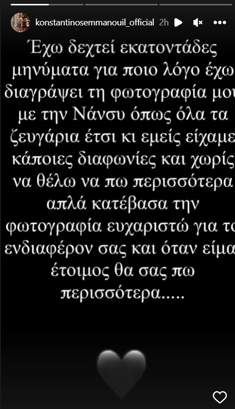 Σε story που δημοσίευσε στο προφίλ του, εξήγησε πως οι διαφωνίες αυτές τον έκαναν να σκεφτεί πιο καθαρά και να ακυρώσει τον αρραβώνα του, που θα πραγματοποιούταν σε δύο ημέρες στο Λονδίνο. «Έχω δεχτεί εκατοντάδες μηνύματα για ποιο λόγο έχω διαγράψει τη φωτογραφία μου με τη Νάνσυ. Όπως όλα τα ζευγάρια, έτσι και εμείς είχαμε κάποιες διαφωνίες και χωρίς να θέλω να πω περισσότερα, απλά κατέβασα τη φωτογραφία. Ευχαριστώ για το ενδιαφέρον σας και όταν είμαι έτοιμος θα σας πω περισσότερα. Σε δυο μέρες θα έφευγα για Λονδίνο για να γίνει ο αρραβώνας μας εκεί, κάτι το οποίο προφανώς ακύρωσα την τελευταία στιγμή γιατί αυτές οι διαφωνίες με έκαναν να σκεφτώ λίγο πιο καθαρά κάποια πράγματα… Θέλω να είμαι ξεκάθαρος και ειλικρινής πριν κάνω κάτι για το οποίο τελικά δεν είμαι σίγουρος επειδή με ρωτάτε πολλά. Όποιος κατάλαβε, κατάλαβε. Να είστε καλά για την αγάπη σας», έγραψε.
