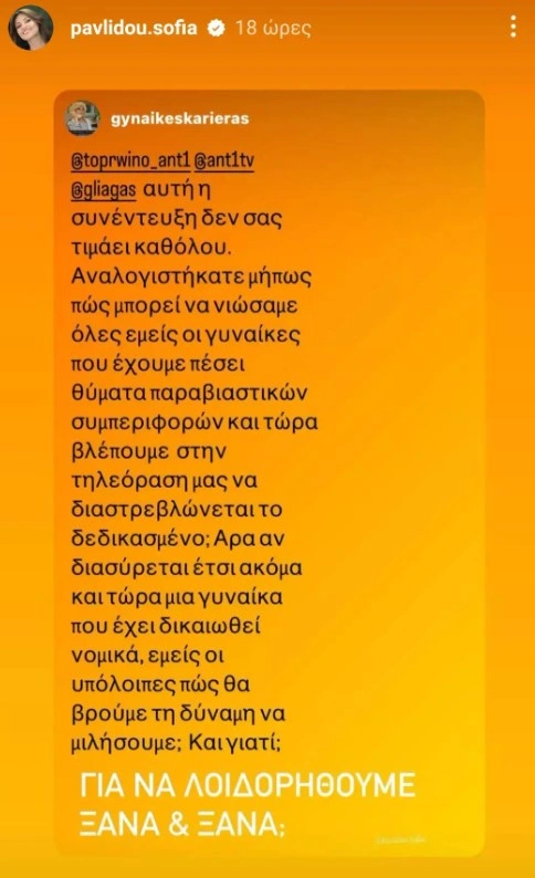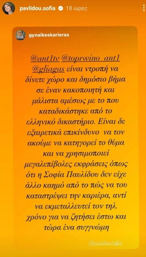 Με μία σειρά από αναρτήσεις στον προσωπικό της λογαριασμό στο Instagram η Σοφία Παυλίδου επέλεξε να τοποθετηθεί για τη συνέντευξη που παραχώρησε ο Μάνος Παπαγιάννης στο «Πρωινό». Ο ηθοποιός, ο οποίος κρίθηκε ένοχος στη δικαστική διαμάχη με τη συνάδελφό του, μίλησε στον Γιώργο Λιάγκα και -μεταξύ άλλων- ανέφερε ότι «η κυρία Παυλίδου μου υποσχέθηκε ότι θα με καταστρέψει, θα με διαλύσει, θα με θάψει ζωντανό και τα κατάφερε, ανεξαιρέτως του αποτελέσματος της δίκης». Η Σοφία Παυλίδου δεν έχει τοποθετηθεί δημόσια μέχρι στιγμής για τη συνέντευξη του ηθοποιού, ωστόσο έκανε repost τα υποστηρικτικά προς το πρόσωπό της σχόλια από την ομάδα «Γυναίκες Καριέρας».