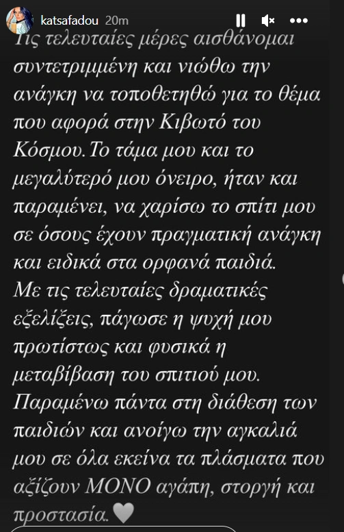 Πιο συγκεκριμένα, η επιχειρηματίας έγραψε: «Τις τελευταίες μέρες αισθάνομαι συντετριμμένη και νιώθω την ανάγκη να τοποθετηθώ για το θέμα που αφορά στην Κιβωτό του Κόσμου.Το τάμα μου και το μεγαλύτερό μου όνειρο, ήταν και παραμένει, να χαρίσω το σπίτι μου σε όσους έχουν πραγματική ανάγκη και ειδικά στα ορφανά παιδιά. Με τις τελευταίες δραματικές εξελίξεις, πάγωσε η ψυχή μου πρωτίστως και φυσικά η μεταβίβαση του σπιτιού μου. Παραμένω πάντα στη διάθεση των παιδιών και ανοίγω την αγκαλιά μου σε όλα εκείνα τα πλάσματα που αξίζουν ΜΟΝΟ αγάπη, στοργή και προστασία».