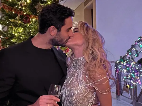 Σε ένα από τα στιγμιότυπα, η Κόνι Μεταξά επέλεγε μια πολύ τρυφερή στιγμή της με τον Μάριο Καπότση, όπου ανταλάσουν ένα παθιασμένο φιλί μπροστά από το χριστουγεννιάτικο δέντρο.