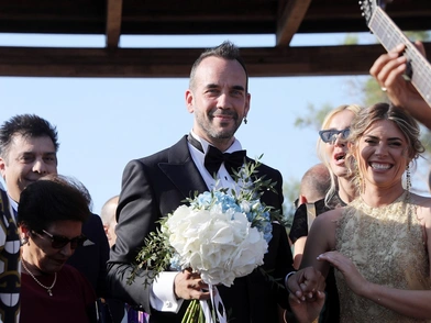 Ο δημοφιλής τραγουδιστής εμφανίστηκε συγκινημένος στην εκκλησία και δεν σταμάτησε να χαιρετάει τους καλεσμένους. Κατά την άφιξή της στην εκκλησία με ένα κάμπριο vintage αυτοκίνητο, η εγκυμονούσα νύφη χειροκροτήθηκε από τους φίλους και συγγενείς, ως είθισται.