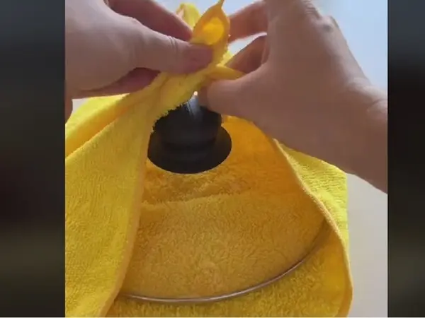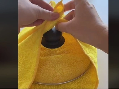 Όταν η ταμπλέτα διαλυθεί, βουτήξτε στο μείγμα την πετσέτα χεριών, για να ρουφήξει το καθαριστικό, και στραγγίξτε τη καλά. Μετά απλώστε τη στον πάγκο, βάλτε από πάνω της ένα καπάκι κατσαρόλας, και δέστε κόμπο τις πλευρές της πετσέτας πάνω από τη λαβή του.