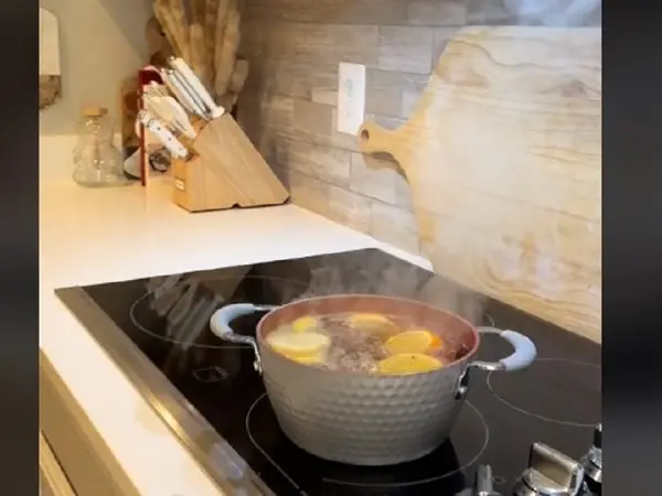 Για το πρώτο της βήμα, το TikToker γέμισε μερικώς μια κατσαρόλα με νερό και την τοποθέτησε στο μάτι για να πάρει βράση. Στη συνέχεια, έκοψε ένα λεμόνι και ένα πορτοκάλι σε φέτες και τα πρόσθεσε στο νερό.