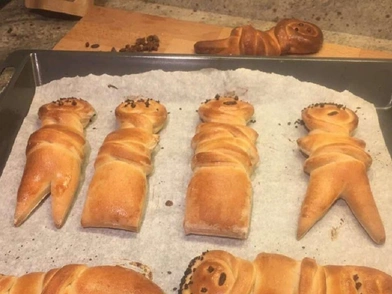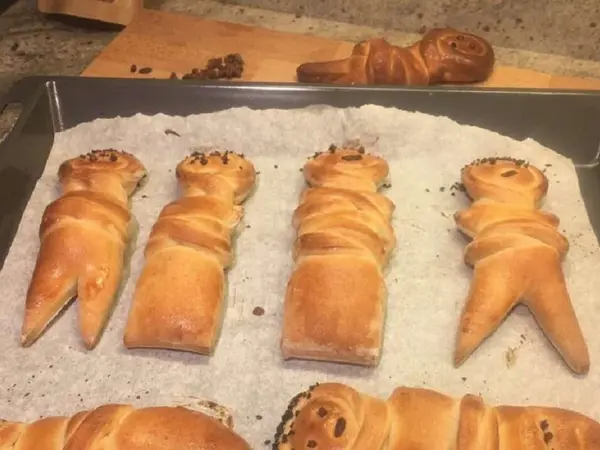 - Χωρίζουμε τη ζύμη σε 6 κομμάτια. Θα πλάσουμε 6 κομμάτια σε σχέδια ανθρώπων.