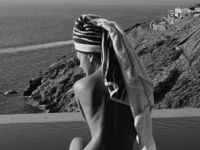 Μέσα από ένα ρετρό ασπρόμαυρο φίλτρο, η εντυπωσιακή Κλέλια ανέβασε μια φωτογραφία της topless να απολαμβάνει τον απέραντο ορίζοντα από την πισίνα του ξενοδοχείου που μένει με τη φίλη της Βάσια Κωσταρά.