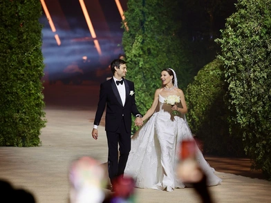 Στις εικόνες που αναρτήθηκαν στα social media φαίνεται το ευτυχισμένο ζευγάρι τόσο κατά τη διάρκεια της γαμήλιας τελετής όσο και στο πάρτι που ακολούθησε, στον ειδικά διαμορφωμένο χώρο στην αψίδα Καλατράβα.