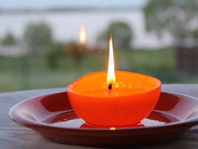 Αφού έχετε αφαιρέσει τη σάρκα, γεμίστε κάθε πορτοκαλόκουπα με ελαιόλαδο, αφήνοντας μισό εκατοστό από το χείλος, για να έχει χώρο το φυτίλι να καεί. Πριν το ανάψετε, φροντίστε να έχετε βρέξει το φυτίλι με λάδι για να καίει πιο αργά, και ανάψτε το με έναν αναπτήρα.