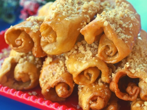 - Ανοίγουμε με έναν πλάστη τη ζύμη σε πολύ λεπτό φύλλο. Κόβουμε σε κομμάτια και τα μεταφέρουμε στο καυτό λάδι. Τηγανίζουμε για 1 λεπτό να πάρει χρώμα.